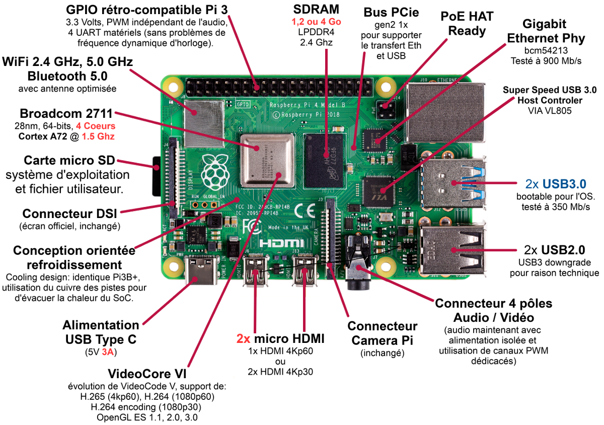- Processeur BCM2711, Quad core Cortex-A72 (ARM v8) 64-bit SoC (System on a Chip) cadencé à 1.8GHz