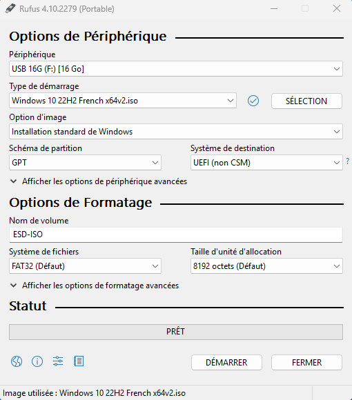 - Lancer le logiciel Rufus et sélectionner les options suivantes :