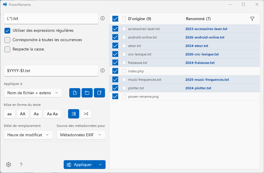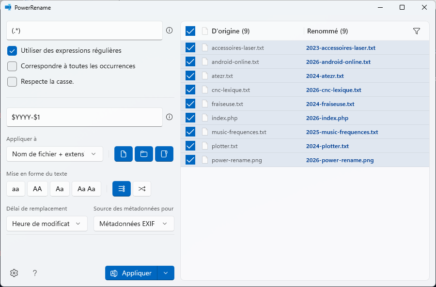 Plus d'informations sur https://learn.microsoft.com/fr-fr/windows/powertoys/powerrename