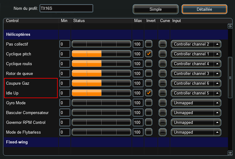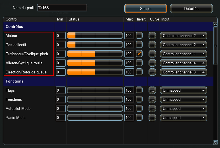 - Adapter les canaux et les sens de débattements liés au manches
