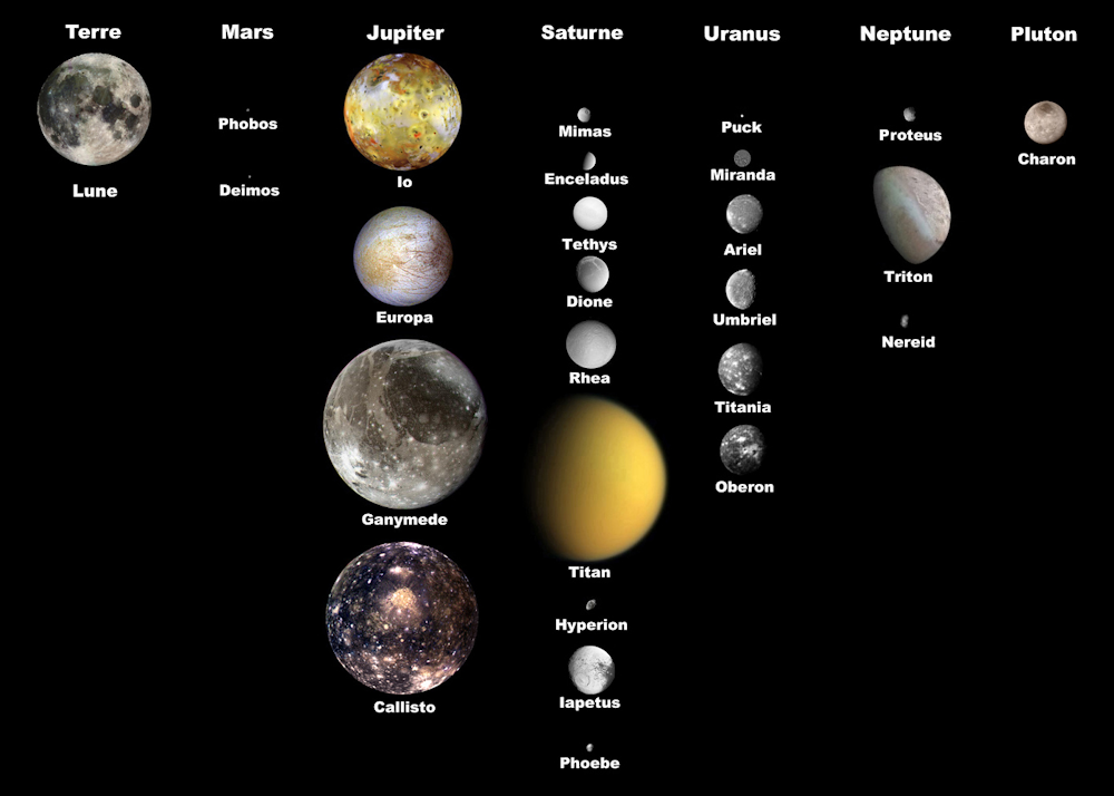 Les plus gros satellites naturels du Système solaire (année de découverte notée entre parenthèses) :