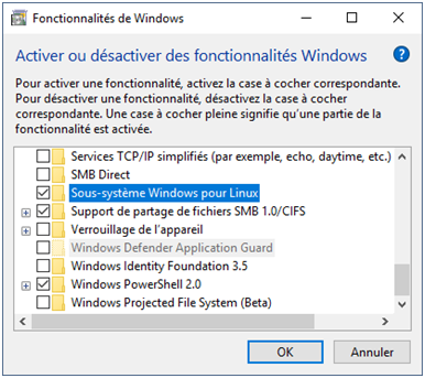 Dans Démarrer / Paramètres / Applications / Programmes et fonctionnalités : Activer ou désactiver des fonctionnalités Windows Activez Sous-système Windows pour Linux puis redémarrez Windows. ![]() |
