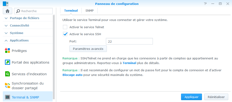 Assurez-vous que SSH est bien activé dans Terminal & SNMP ![]() |