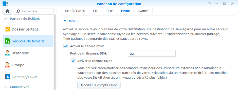 Activez le service rsync depuis Panneau de configuration / Services de fichiers / rsync ![]() |