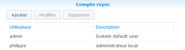 Dans Modifier le compte rsync ajoutez l’utilisateur et saisissez deux fois son mot de passe ![]() Dans cet exemple les transferts s'effecturont vers /volume1/homes/philippe/ |