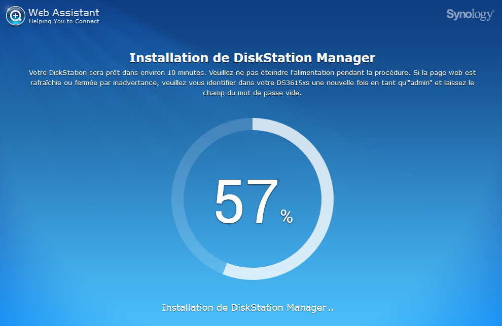 Dans l’assistant qui apparait cliquez sur Configurer puis sélectionnez Installation manuelle. Sélectionnez le fichier DSM_DS3615xs_5.2-5644.pat fourni dans l'archive et cliquez sur Installer maintenant. Un message vous prévient que les disques dur seront effacés, acceptez. Le serveur redémarre automatiquement à la fin de l’installation. |