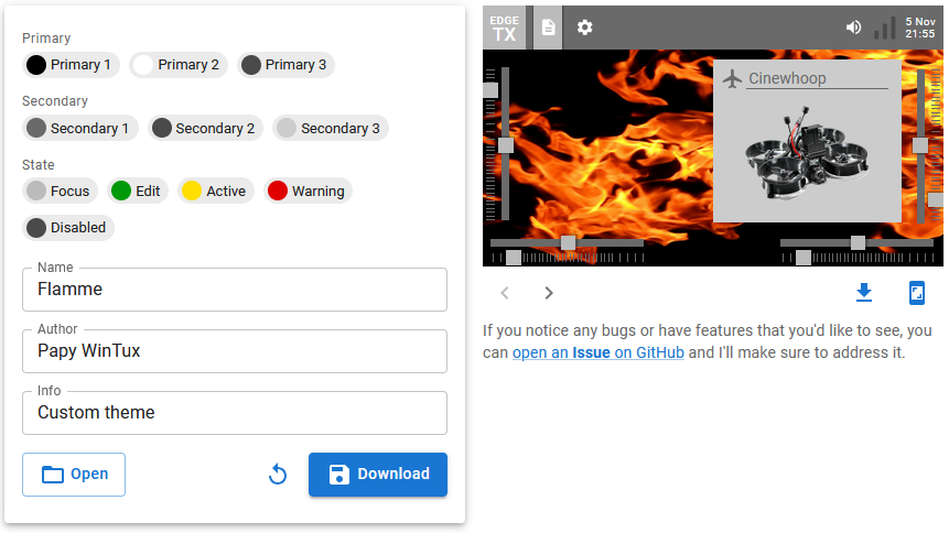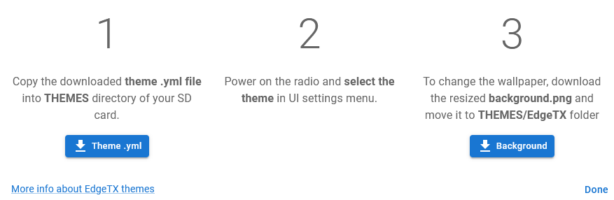 | Dossier SOUNDS | edgetx-sdcard-sounds-fr-2.10.0.zip | Décompresser à la racine de la carte SD |